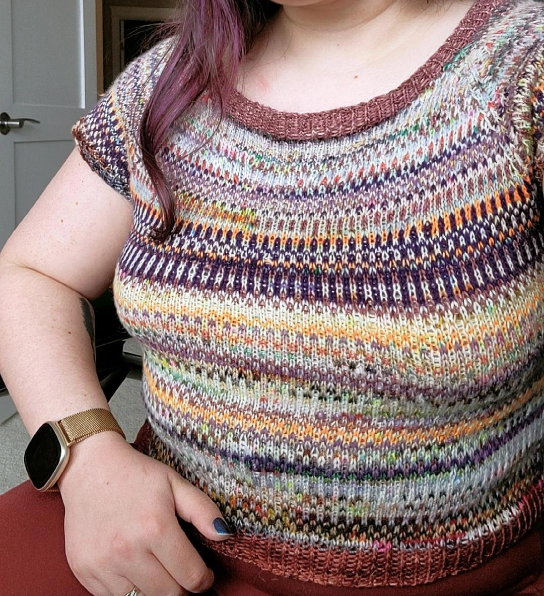 Last summer I made another The Little Wolf Knits’ Twisted Tea Shirt, with a touch of Sea Glass Tee-esque 1×1 alternating colourwork.