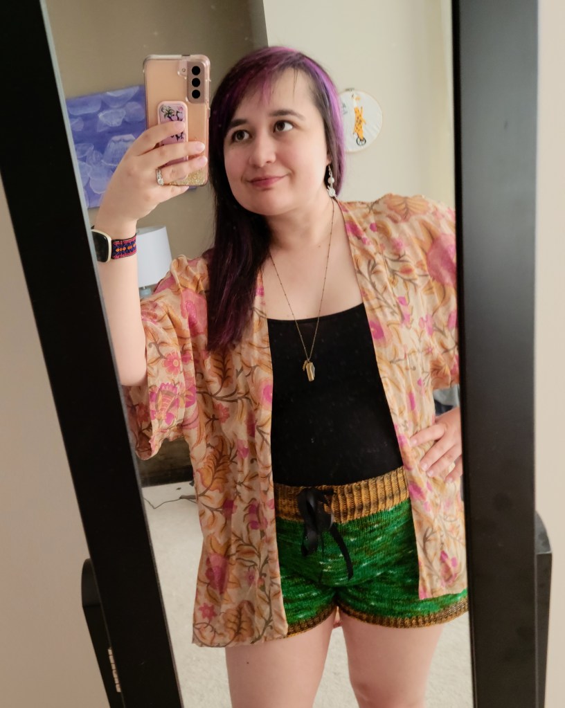 The shorts also include an i-cord drawstring, but I decided to use a black silk ribbon for mine since I was in a hurry. Maybe one day I’ll have the time and energy to knit up an i-cord long enough to go around my waist, but until then, I quite like the mixed-medium vibe.