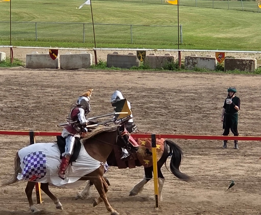We had tickets for a feast that evening that started at 6:30, but when 8 p.m. came, and we still hadn’t eaten, we decided to duck out early instead. If we’d stayed all the way through, we wouldn’t have gotten home until almost midnight, and that didn’t jibe with the fact we had another big drive ahead of us the next day. At least we still got to enjoy the atmosphere, live band, and lively company! And I got to take home my drinking horn and medieval cutlery.