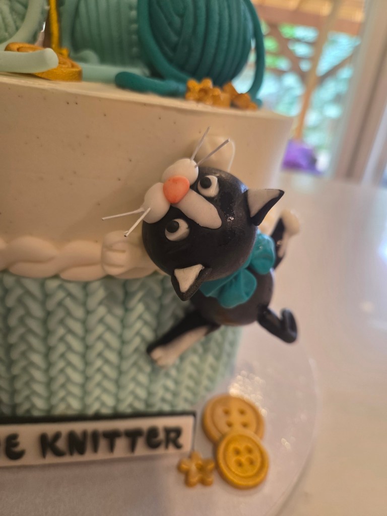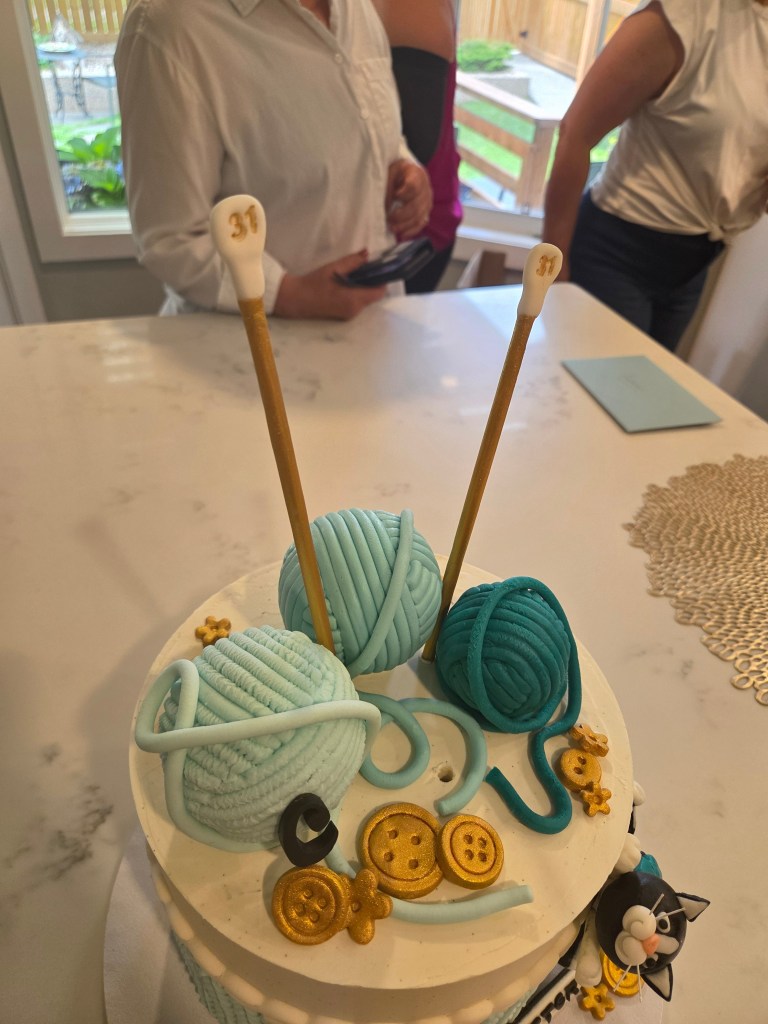 My mom’s cousin, Leanne, is an unbelievably talented baker and cake decorator, and she made me the most incredible knitting-themed cake! The cake itself was vanilla with lemon between the layers, and vanilla icing. Decorated with moulded fondant stitches and buttons, a pair of “31” knitting needles, and a little fondant facsimile of Seabreeze. The yarn balls she made with fondant layered over styrofoam spheres.